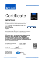 The process-oriented FFG quality management system ensures optimal design and standardization of corporate processes. The goal is to maintain and increase effectiveness and efficiency without losing sight of the necessary flexibility. Our quality management system is certified according to DIN EN ISO 9001 and meets much higher requirements in many areas.